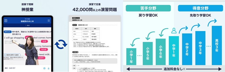 特長 | AIが理解度を分析し、苦手単元を自動復習。 視覚的にもわかりやすい教材設計。 |