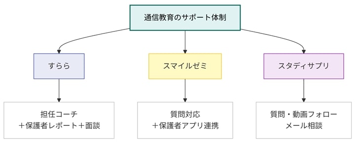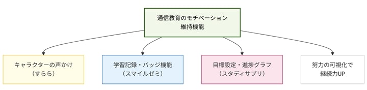 親のサポート | 通信教育の進捗確認や声かけ、達成を一緒に喜ぶサポート。 | 家庭内で安心感を得られ、モチベーションが維持しやすい。 |